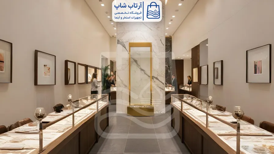- در کنار ویترینهای طلا: آبنماهای شیشه ای میتوانند پسزمینهای زیبا برای نمایش طلا و جواهرات فراهم کنند و آنها را برجستهتر و جذابتر کنند.