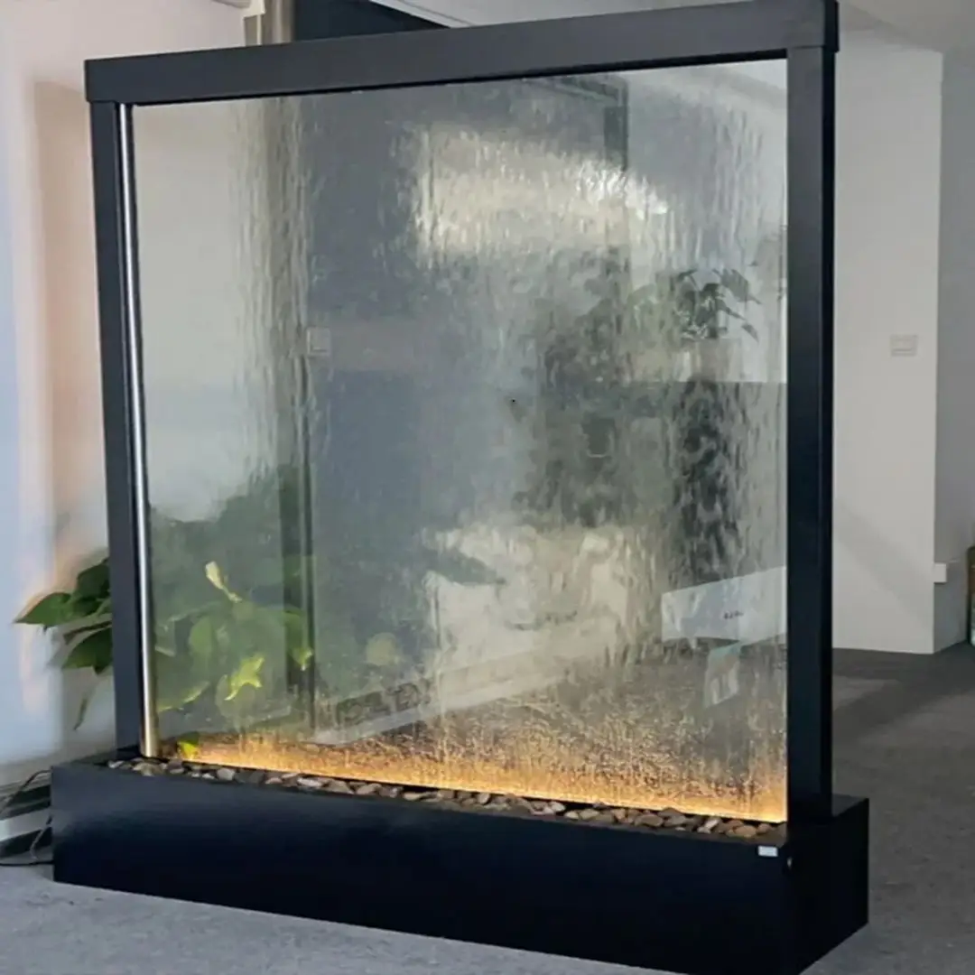 - آبنمای شیشهای از یک صفحه شیشهای یا پلکسی استفاده میکند که آب از بالای آن به سمت پایین جاری میشود. پمپ آب، آب را به بالای پنل میفرستد تا با کمک جاذبه به پایین بازگردد.